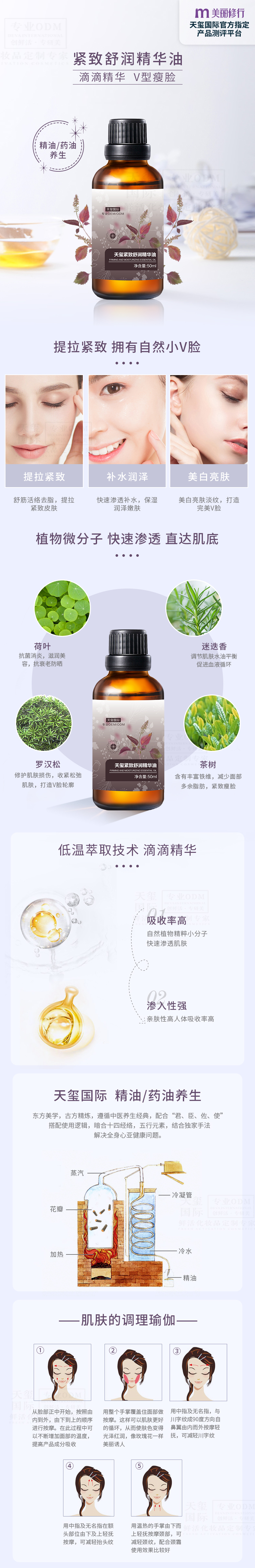 本紧致舒润精华油OEM运用低温萃取技术提取得到,小分子植物精粹快速渗透肌底,舒筋活络去脂,提拉紧致肌肤,保湿润泽嫩肤