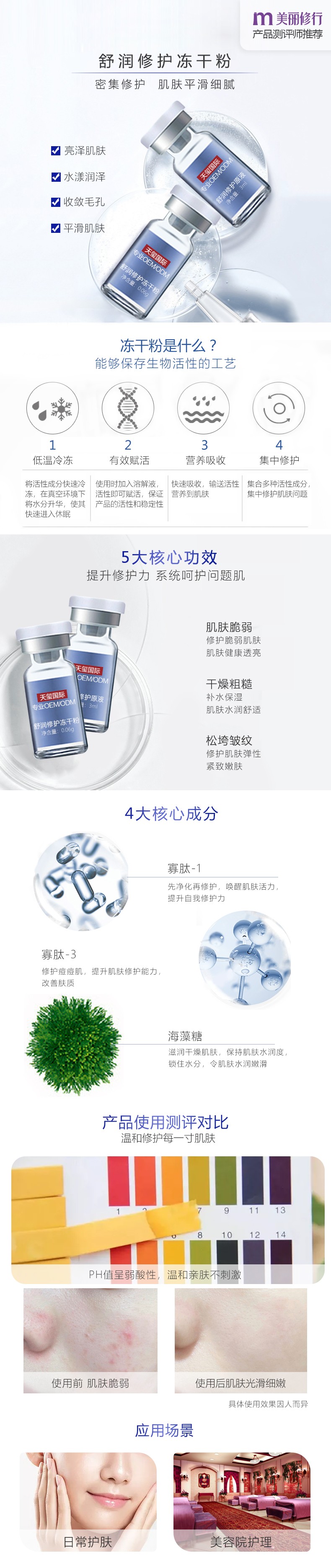 5大核心功效,修护脆弱肌肤,补水保湿;4大核心成分,海藻糖成分滋润干燥肌肤;密集修护,肌肤平滑细腻