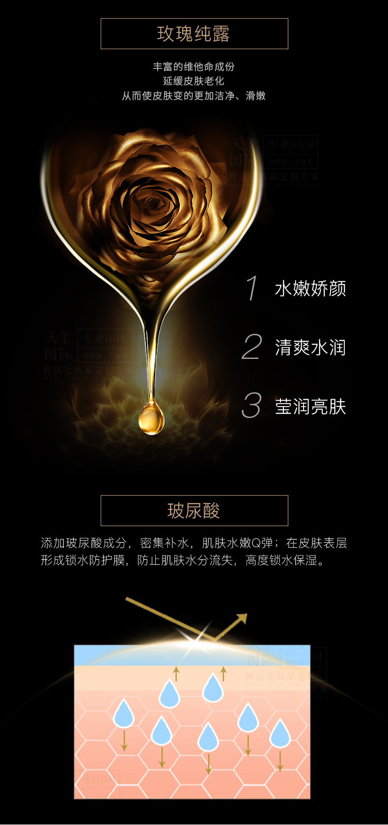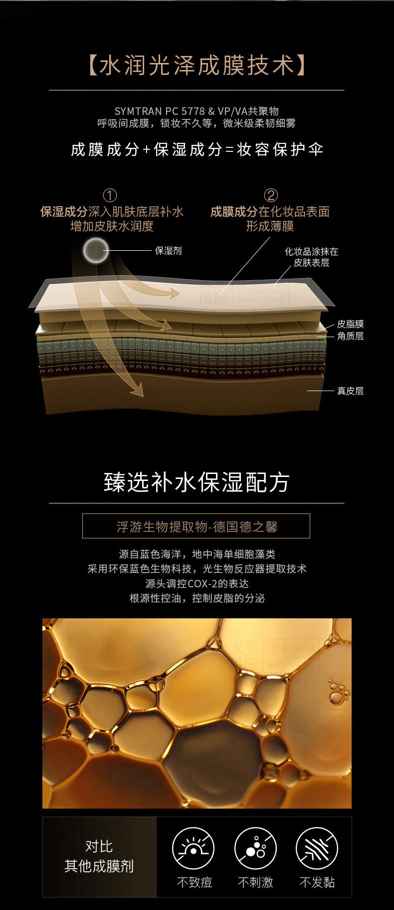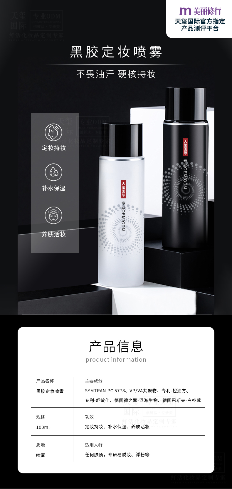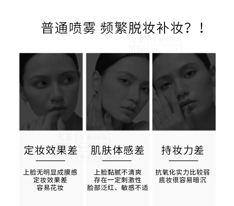 12s成膜,12h定妆膜法;水润光泽保护膜,在底妆表层锁妆护肤;复配补水保湿配方,高保湿成分;微米柔雾技术,近90度扇形细雾