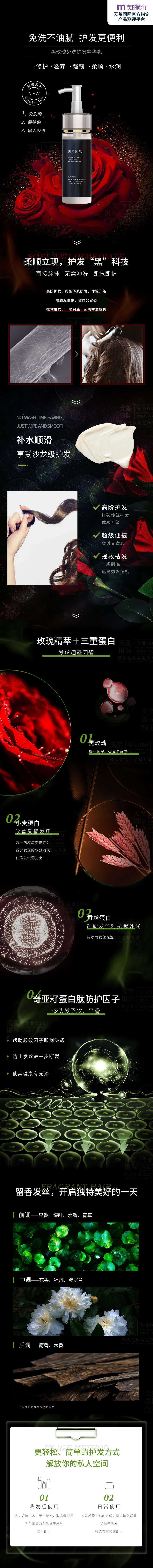 玫瑰精萃+三重蛋白,发丝润泽闪耀;奇亚籽蛋白肽防护因子;采用芬美意异味控制技术,留香发丝
