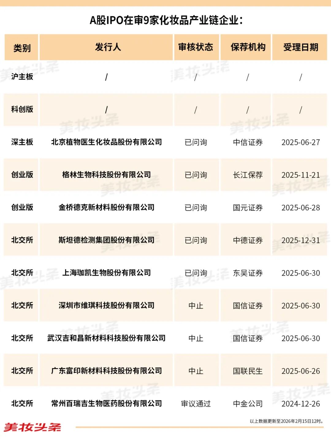 特别需要指出的是,在经历了2025年沪市主板、深市主板、创业板全年“颗粒无收”的尴尬后,2026年开年,沪市主板、科创板依然没有新的化妆品产业链企业IPO排队。